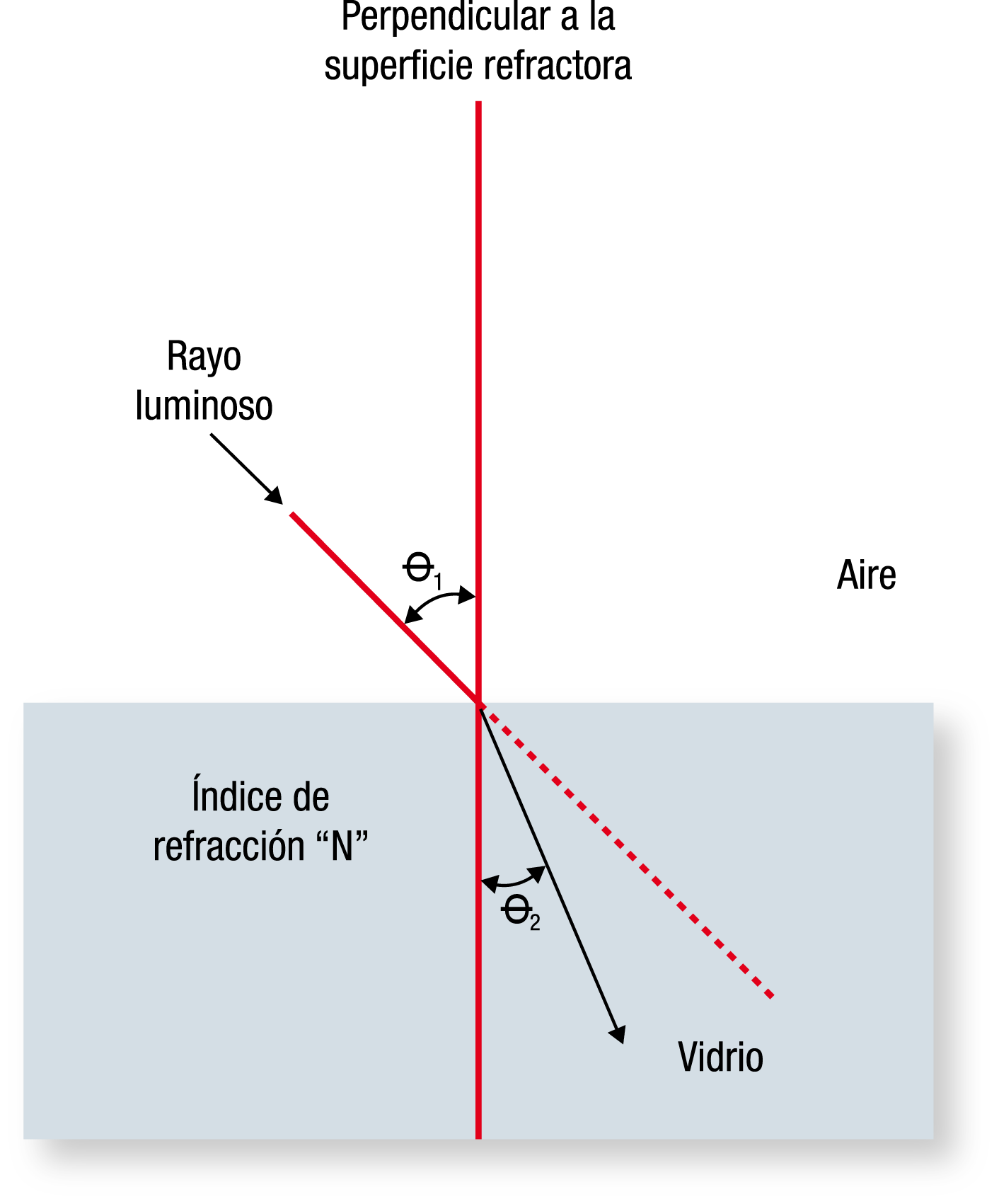 El índice de refracción (N o N1) de un material transparente depende de la densidad del medio , o sea, cuánto se desvían los rayos de luz. Debido a esto cuando un rayo incide de forma oblicua sobre un medio con un índice de refracción mayor, se desviará hacia la normal, mientras que si incide sobre un medio con un índice de refracción menor, se desviará alejándose de ella.