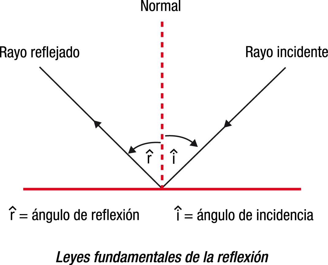 1.- El ángulo que forma la onda incidente y la onda reflejada con la normal (recta perpendicular al plano) son iguales. Estos ángulos se llaman ángulo de incidencia(i) y ángulo de reflexión (r) o como se le suele llamar también: