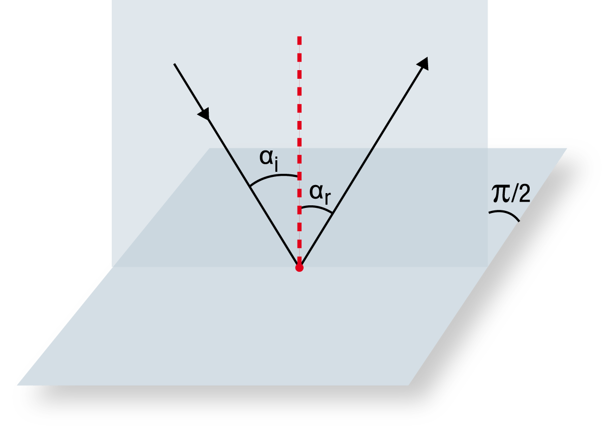 2.- El rayo correspondiente de una onda incidente y el rayo que le corresponde de la onda reflejada están ambos contenidos en un mismo plano, y además dicho plano es perpendicular a la superficie de separación entre los medios en el punto de incidencia del rayo (ver la siguiente figura).