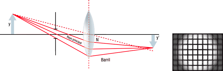 Este tipo de distorsiones rompen la relación de semejanza entre imagen y objeto y se dan con lentes convexas (convergentes) de una curvatura grande que realizan una difracción muy acentuada cuando el rayo de luz da en la cara anterior de la lente. Esta distorsión tiene dos variables; por un lado cuando los rayos se aumentan en la parte central, tanto en la parte inferior como en la superior, y al que se denomina efecto tonel (también se le llama distorsión negativa). Podemos apreciar su efecto en la figura siguiente.