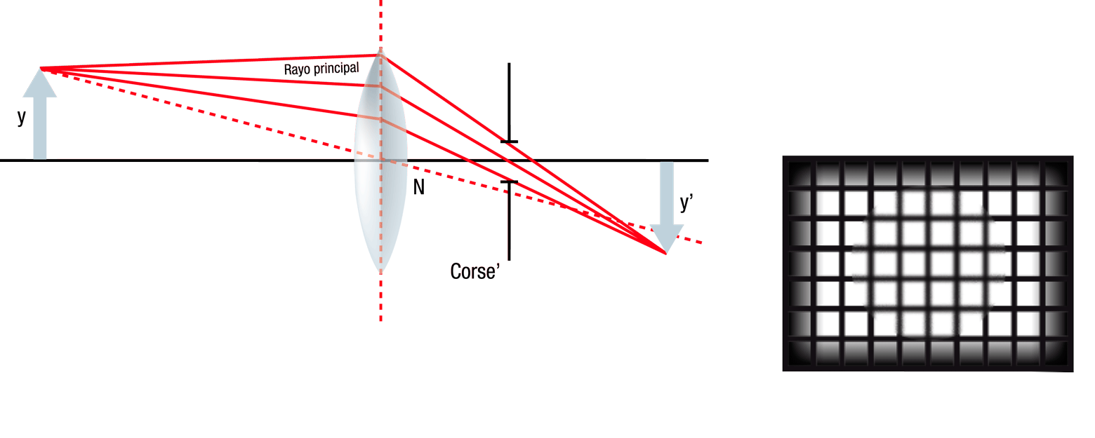 Esta aberración cromática se produce cuando para distintas longitudes de onda se producen diferentes aumentos, haciendo variar el tamaño de la imagen. En la siguiente figura se puede comprobar la inclinación de la lente con respecto al eje óptico.