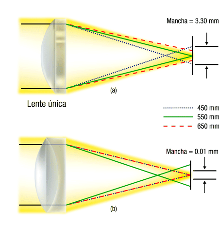 Este espectro se produce porque los distintos colores de la luz tienen distintas velocidades dentro del material de las lentes y por lo tanto distinto índice de refracción. En la siguiente figura se observa como el rayo de luz blanca al dispersarse cuando pasa a través de la lente se descompone en las diferentes longitudes de onda que la componen.