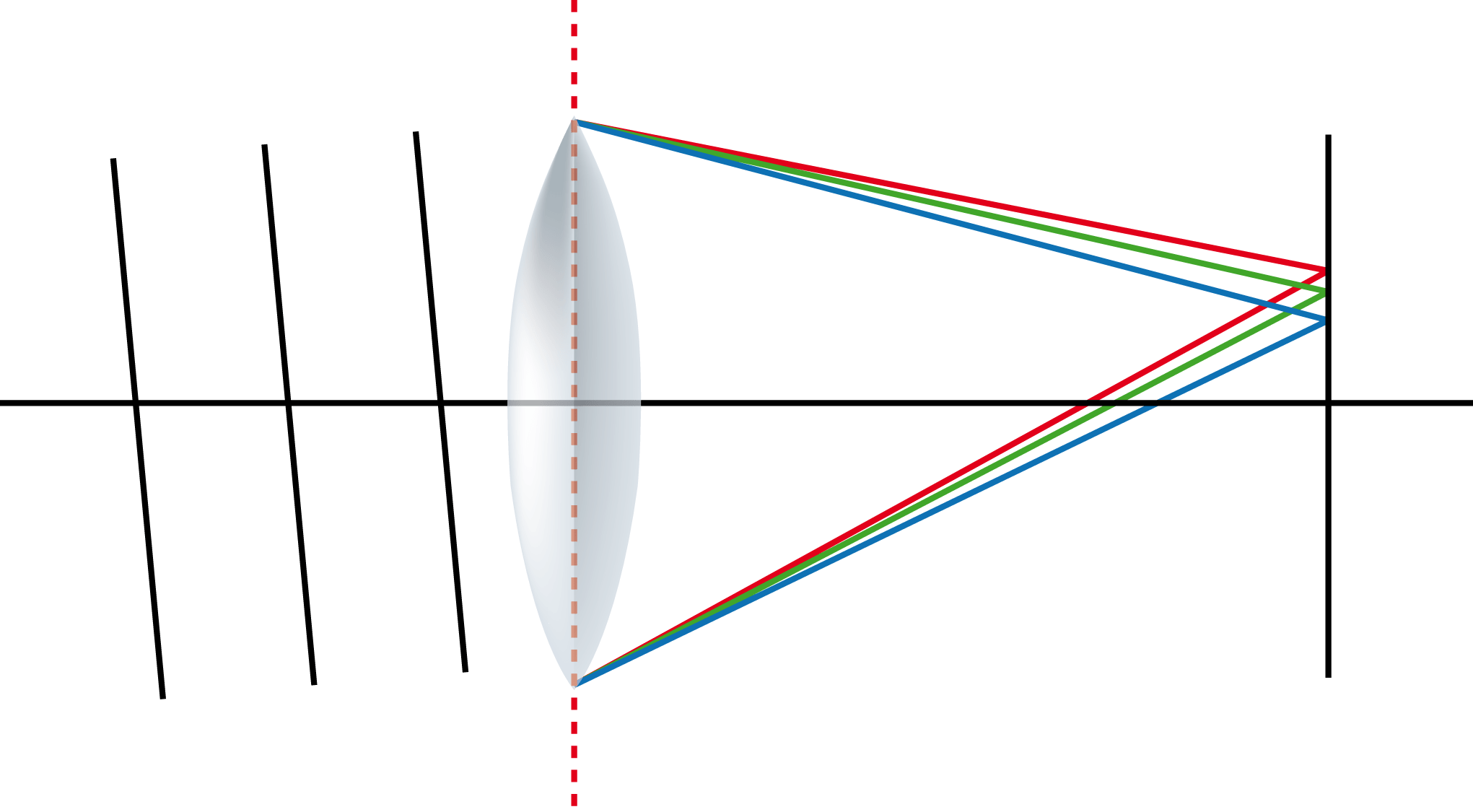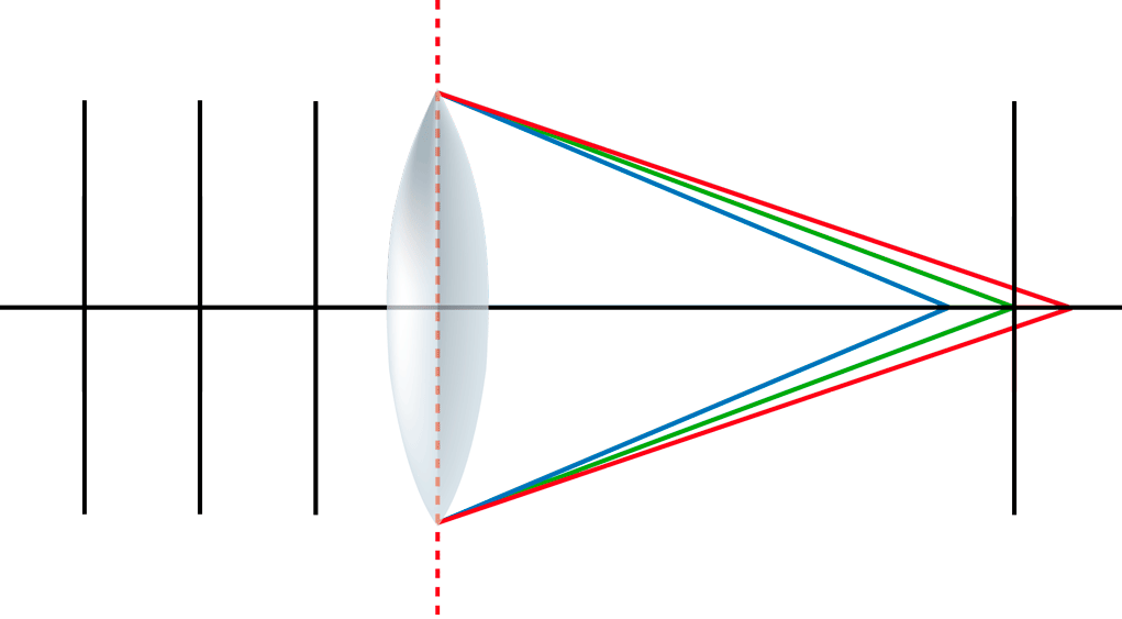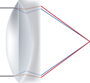 – La aberración cromática axial (longitudinal). Esta se produce cuando para dos longitudes de ondas diferentes (el caso de los diferentes colores) existen diferencias de foco. Esto lo podemos ver en la siguiente figura.
