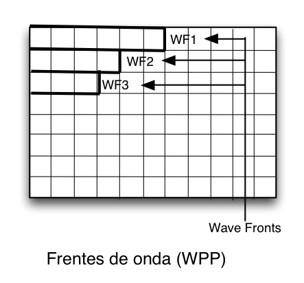 Por último tenemos el procesamiento paralelo de frente de onda o WPP que es el que va a permitir que cada hilera se pueda dividir en unidades de codificación en estructura de árbol o CTUs. Alternativamente con la WPP una imagen o un segmento se pueden dividir en hileras de unidades de transporte se puede decodificar por si misma, pero las siguientes tienen que tener en cuenta la anterior hilera para su correcta decodificación. Esto se puede apreciar en la siguiente imagen.