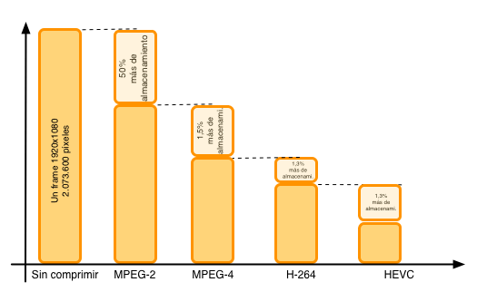 Uno de los sistemas de compresión utilizados (sino el que más) en la compresión de 4K y 8K es el HEVC (High Efficiency Video Coding) o también llamado H.265. Este códec de compresión es capaz de disminuir el flujo de datos hasta un 50% si se compara con el códec H-264 o hasta un 75% si lo comparamos con el códec de compresión MPEG-2, siempre sin tener que sacrificar la calidad de la señal de vídeo.