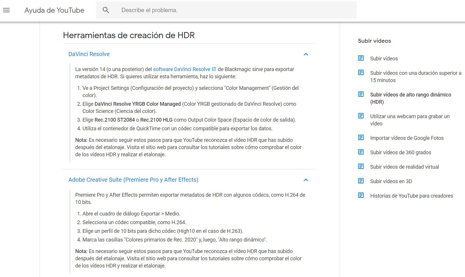 La propia documentación de Google nos da las respuestas que necesitamos. Lo primero que nos indican desde la compañía estadounidense es que los vídeos deben disponer de metadatos HDR en el códec o en el formato del mismo. Para ello, nos recomiendan el uso de aplicaciones compatibles con este sistema como DaVinci Resolve, Adobe Premiere Pro o Adobe After Effects, e incluso nos muestran paso a paso cómo conseguir una óptima exportación. Además, en esta documentación, nos hablan de una herramienta para incluir los metadatos HDR necesarios a nuestros vídeos en caso de no haber podido exportarlos de la manera aconsejada. De esta forma, la subida del vídeo se realizará de la forma habitual y Youtube detectará la información de metadatos y codificará el contenido en HDR para dispositivos compatibles y en estándar para el resto de los aparatos.