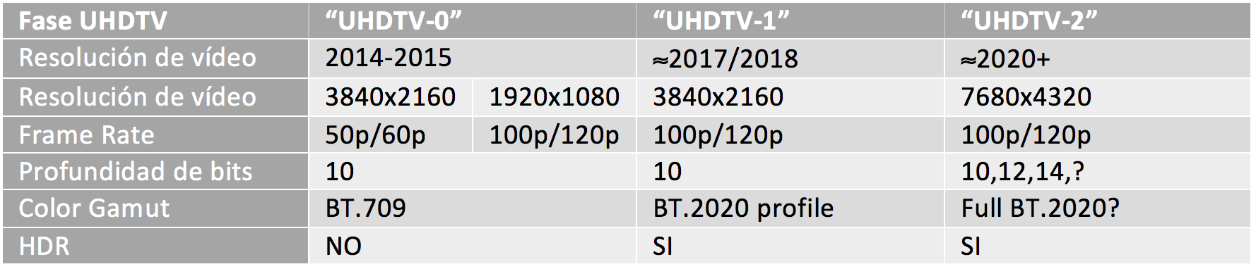 Como puedes observar, en la fase UHD-0 que acabó supuestamente en 2015 y contemplaba una resolución del HD a 1920×1080 hacia la UHD de 3840×2160, sólo se contemplaba una profundidad de 10bits, una frecuencia de cuadro de 50/60Hz y el espacio de color se corresponde con el de la ITU-R BT.709. Esta fase no contempla datos de HDR.