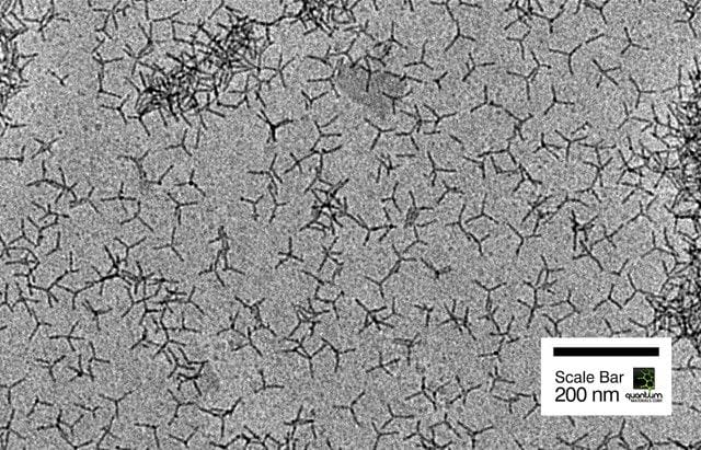 Los puntos cuánticos tetrápodos desarrollados por Quantum Materials tienen cuatro brazos  que ayudan a prevenir la agregación, por lo que parece que son más fáciles de imprimir en una gran variedad de sustratos. Lo cierto es que aquí reconozco que me pierdo, porque puedo llegar a entender que los puntos cuánticos (que son estructuras del orden de nanometros) tengan una estructura que es la que influye a la hora de aprovechar sus propiedades tanto ópticas como eléctricas, pero la definición anterior ciertamente se me escapa.