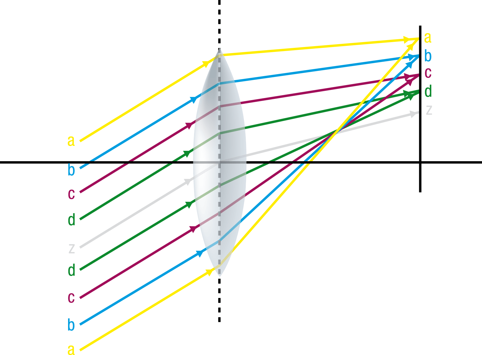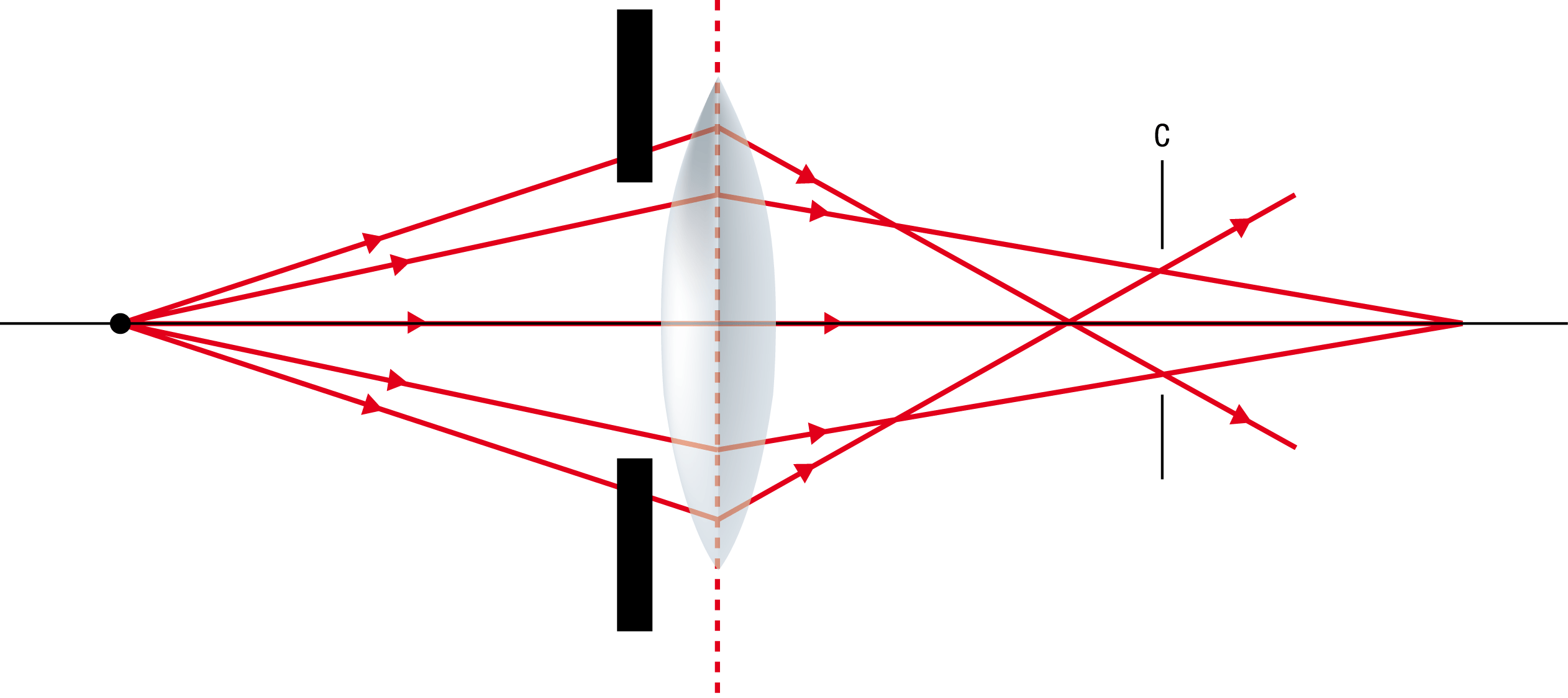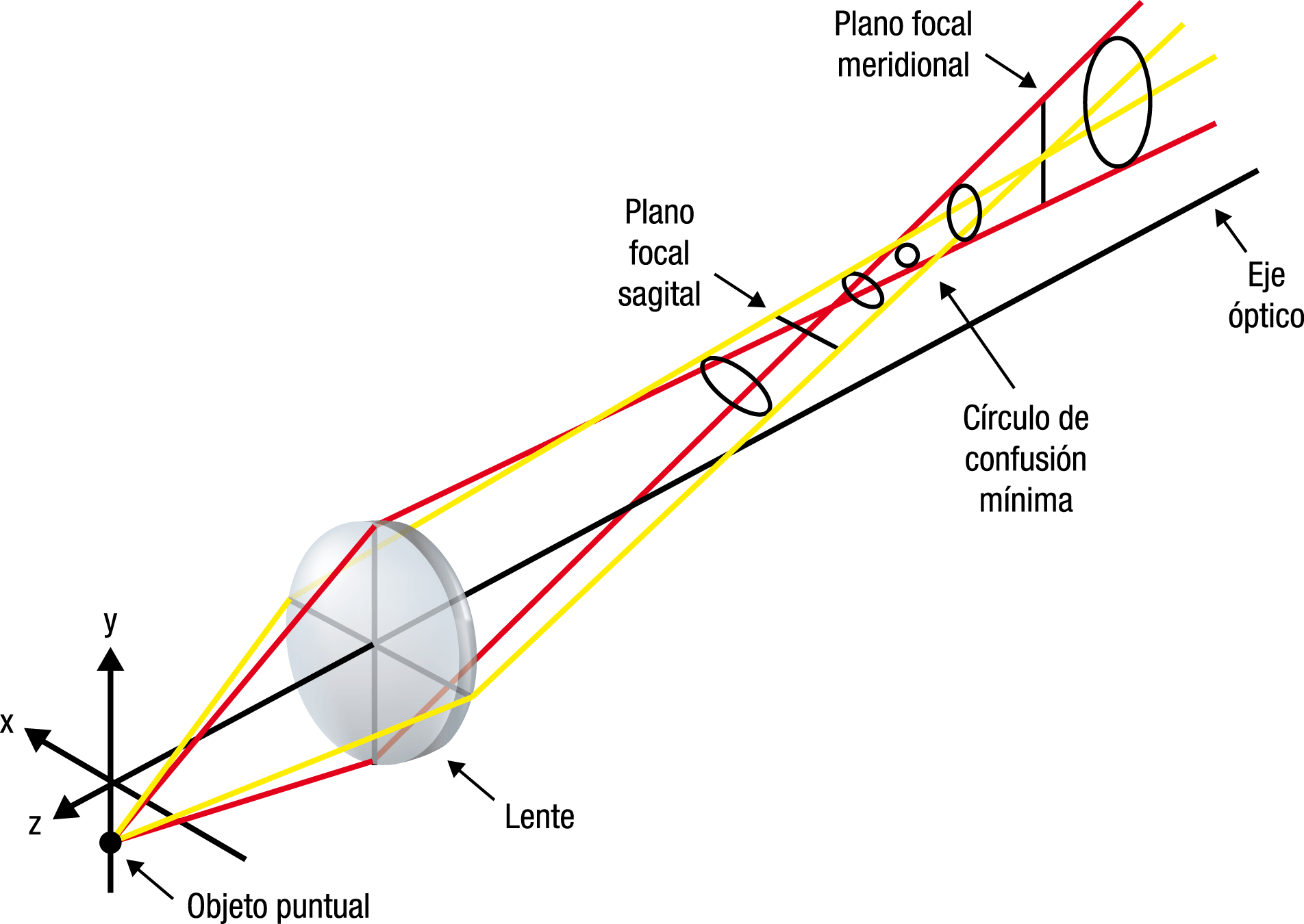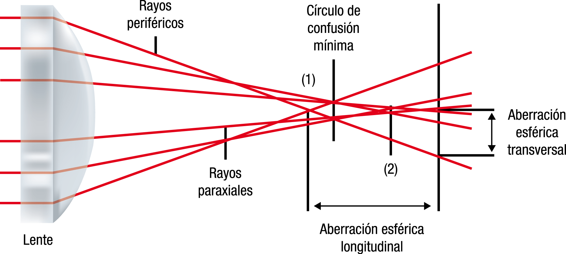 Los rayos que entran en la cara anterior de la lente a distinta altura, hacen foco en distintos puntos del plano imagen de manera que se forman un círculo con cada uno de ellos de diámetros diferentes y a distintas distancias del eje.