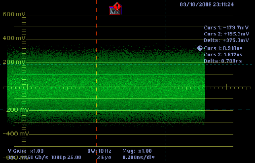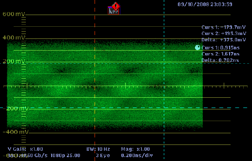 Por último, si los equipos los conectamos con un cable de 80 metros de longitud, lo que observaríamos en el diagrama de ojo sería una imagen como la siguiente.