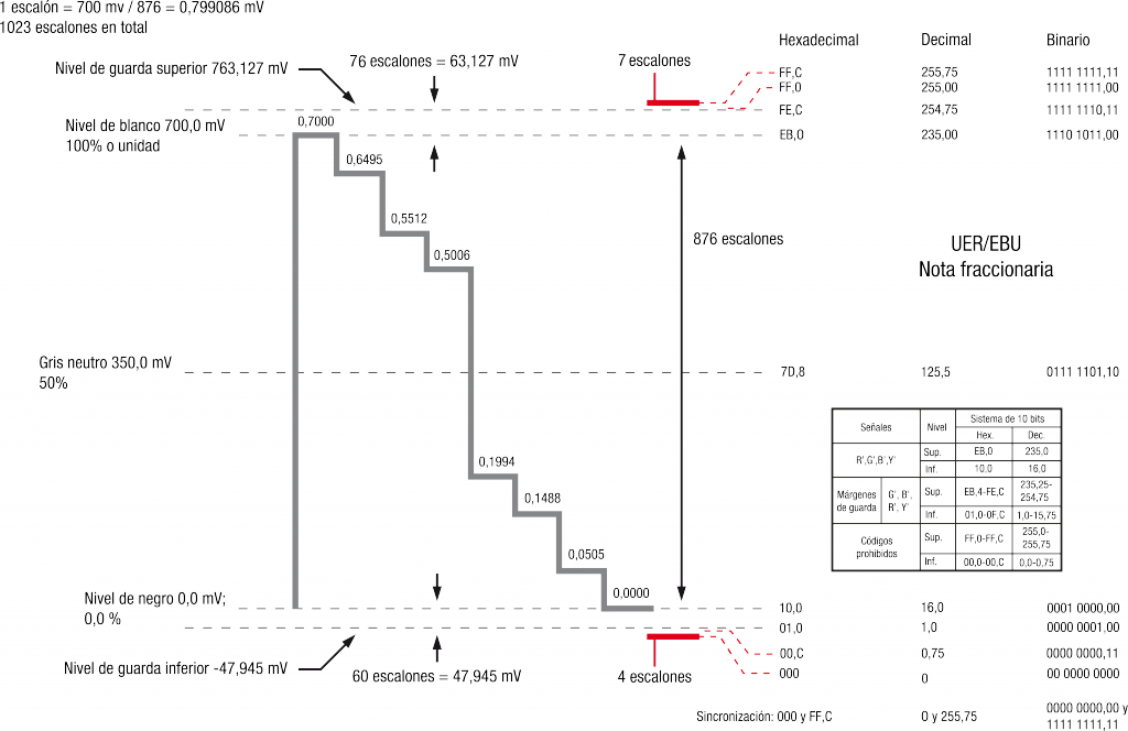 En cuanto a los niveles totales está claro, una señal de 10 bits tiene 1024 niveles de cuantificación, pero los niveles que se toman como referencia son el nivel 64 (en decimal) para el nivel de negro y el 940 para el nivel de blanco, pudiendo este último sobrepasarse 1,23 veces.