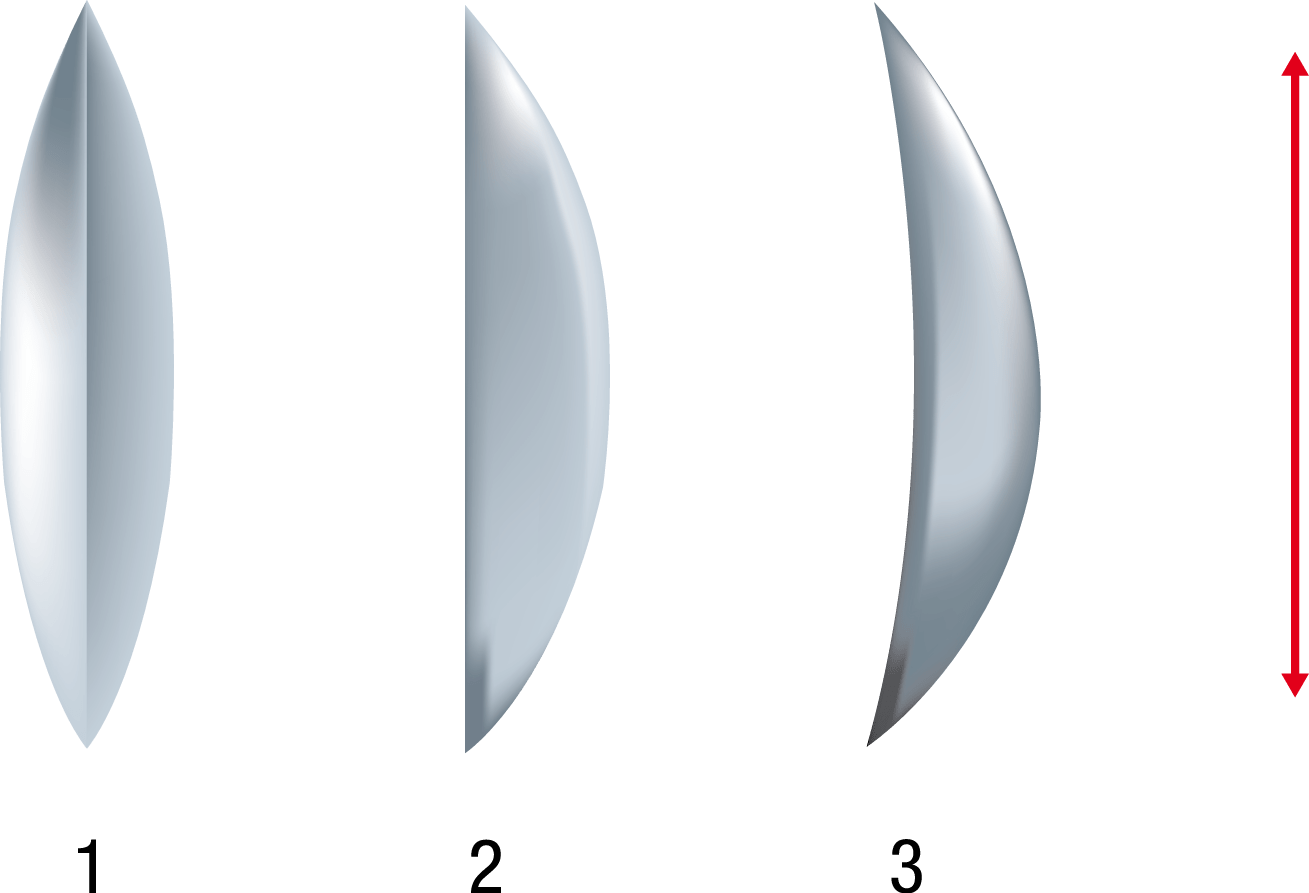 En la figura siguiente, la lente 1 se denomina biconvexa, la 2 plano-convexa y la 3 cóncavo-convexa (menisco convergente).