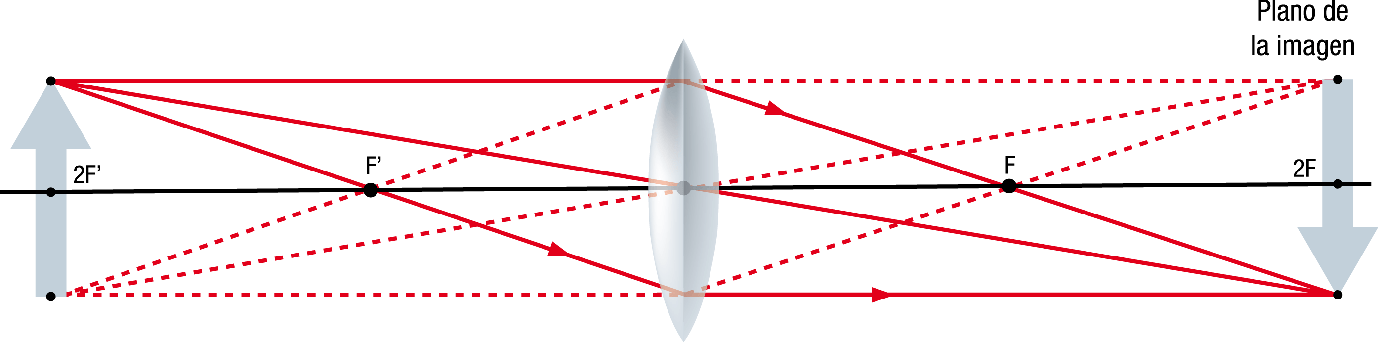 Imagen@tilanotv.esLas líneas discontinuas representan lo mismo que las que proceden de la punta de la flecha. Cuando los rayos paralelos al eje, son refractados por la lente, se cruzan en un punto con este eje al cual se le denomina plano focal primario, y está a una unidad de longitud focal (F). Este es un punto muy importante, ya que en este plano, es donde se coloca el target del CCD, y también se le denomina plano focal.