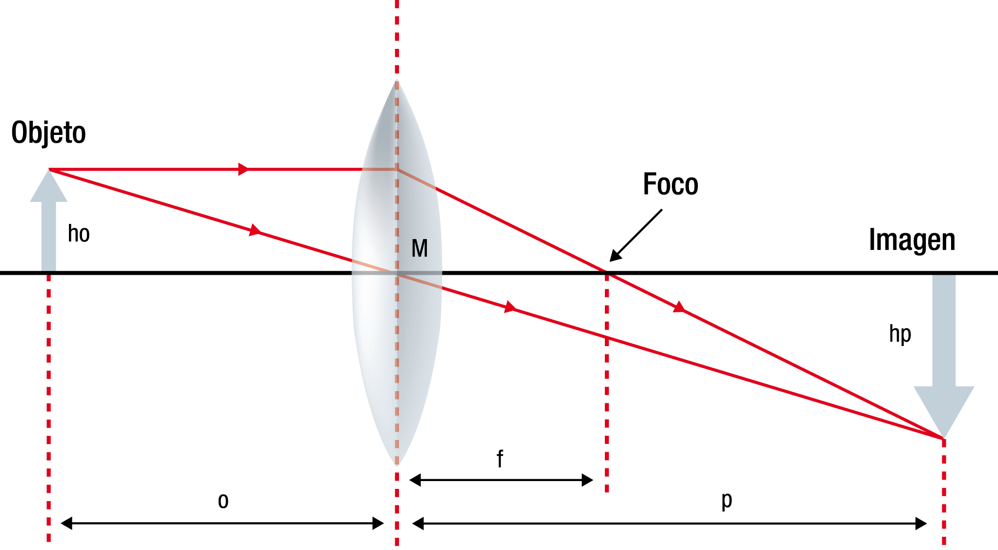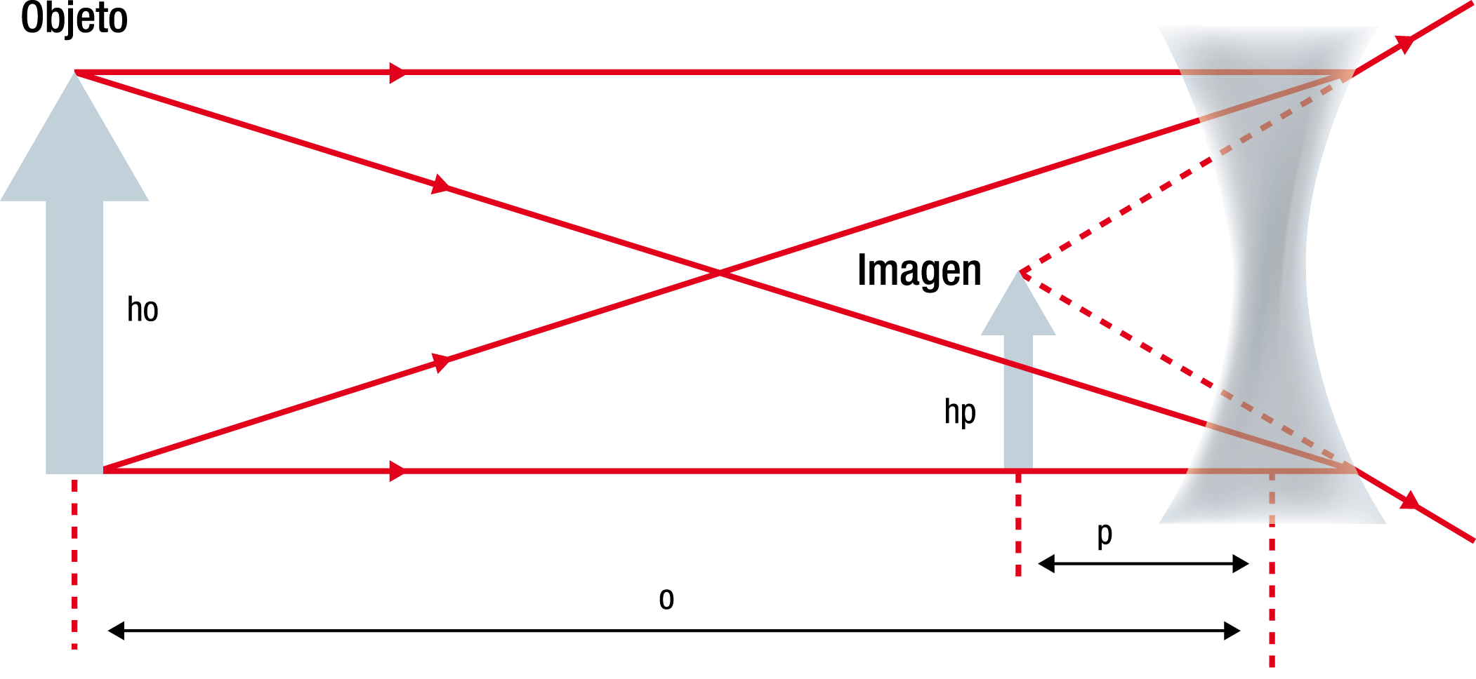 La capacidad que tiene una lente de magnificar o también llamada ampliación lineal de un objeto “N” será N = hp/ho, siendo “hp” y “ho” las alturas de la imagen y del objeto respectivamente, y por tanto N = p/o.