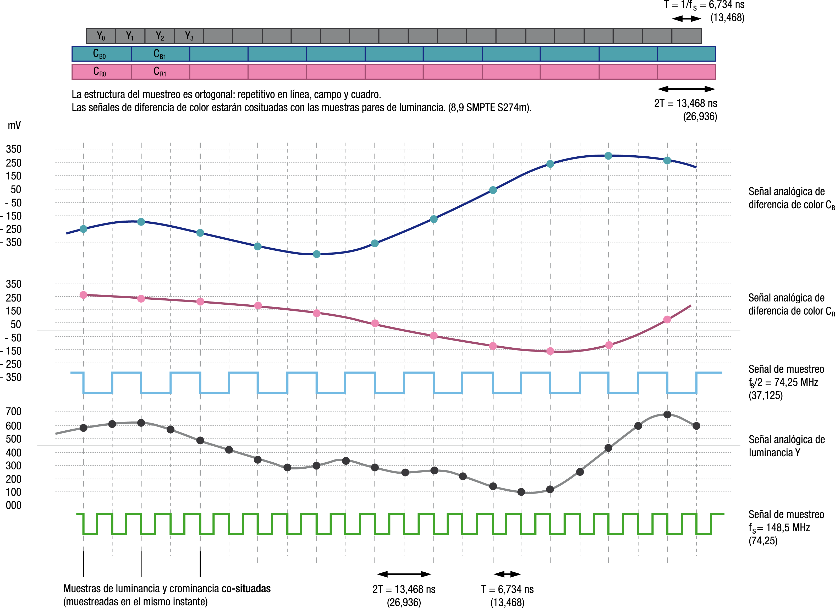 Se puede observar que, teniendo en cuenta el flanco de bajada de cada una de las dos frecuencias de muestreo se van tomando las muestras, tanto de la señal de luminancia, que se hace a una frecuencia de 148,5MHz, como las señales diferencia de color Cb y Cr que se muestrean a una frecuencia de muestreo de 74,25MHz.
