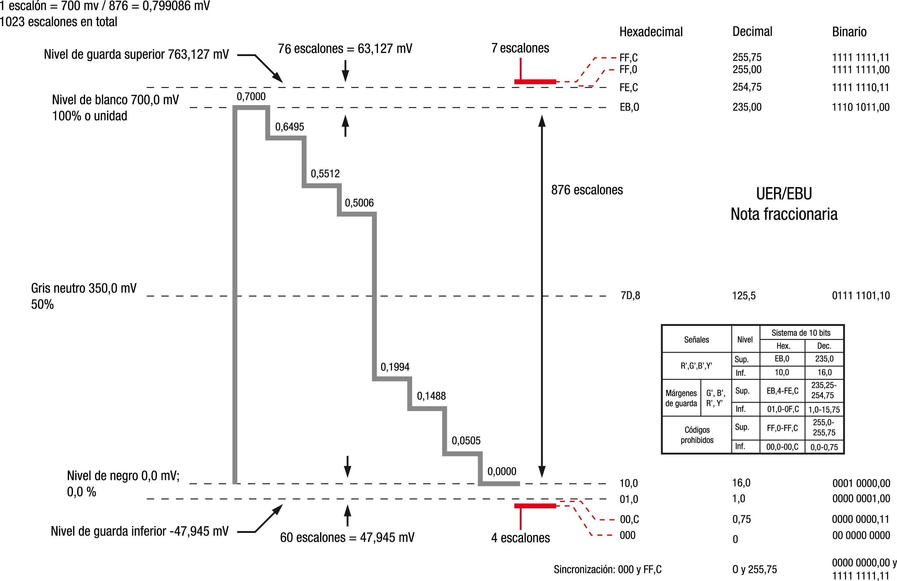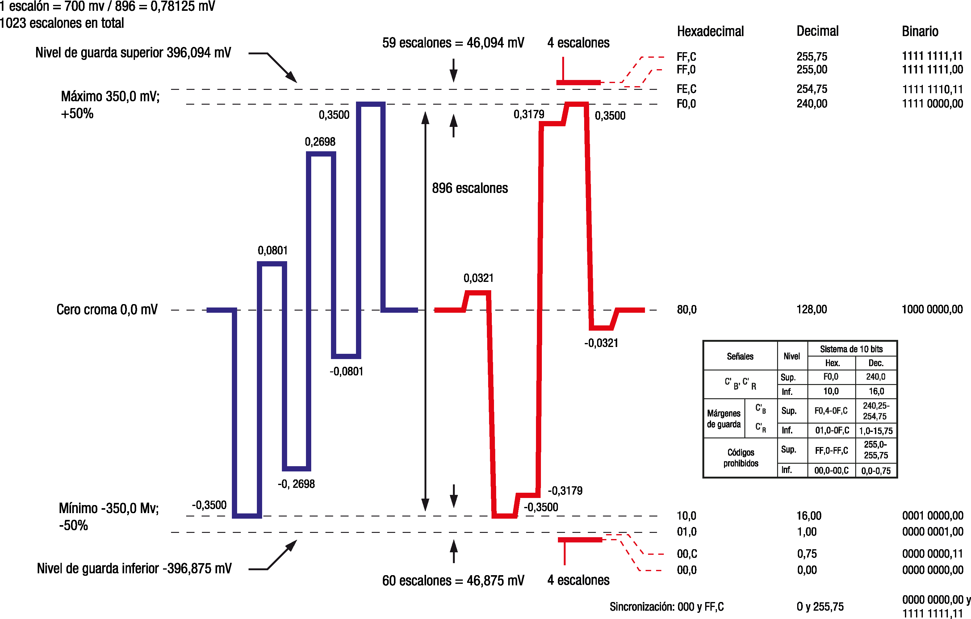 En esta ocasión, en lugar de obtener 256 niveles obtenemos 1024 niveles, de los cuales disponemos de 76 escalones de guarda en la parte superior y 60 escalones de guarda en la parte inferior de la señal, quedando de vídeo efectivo 876 escalones.