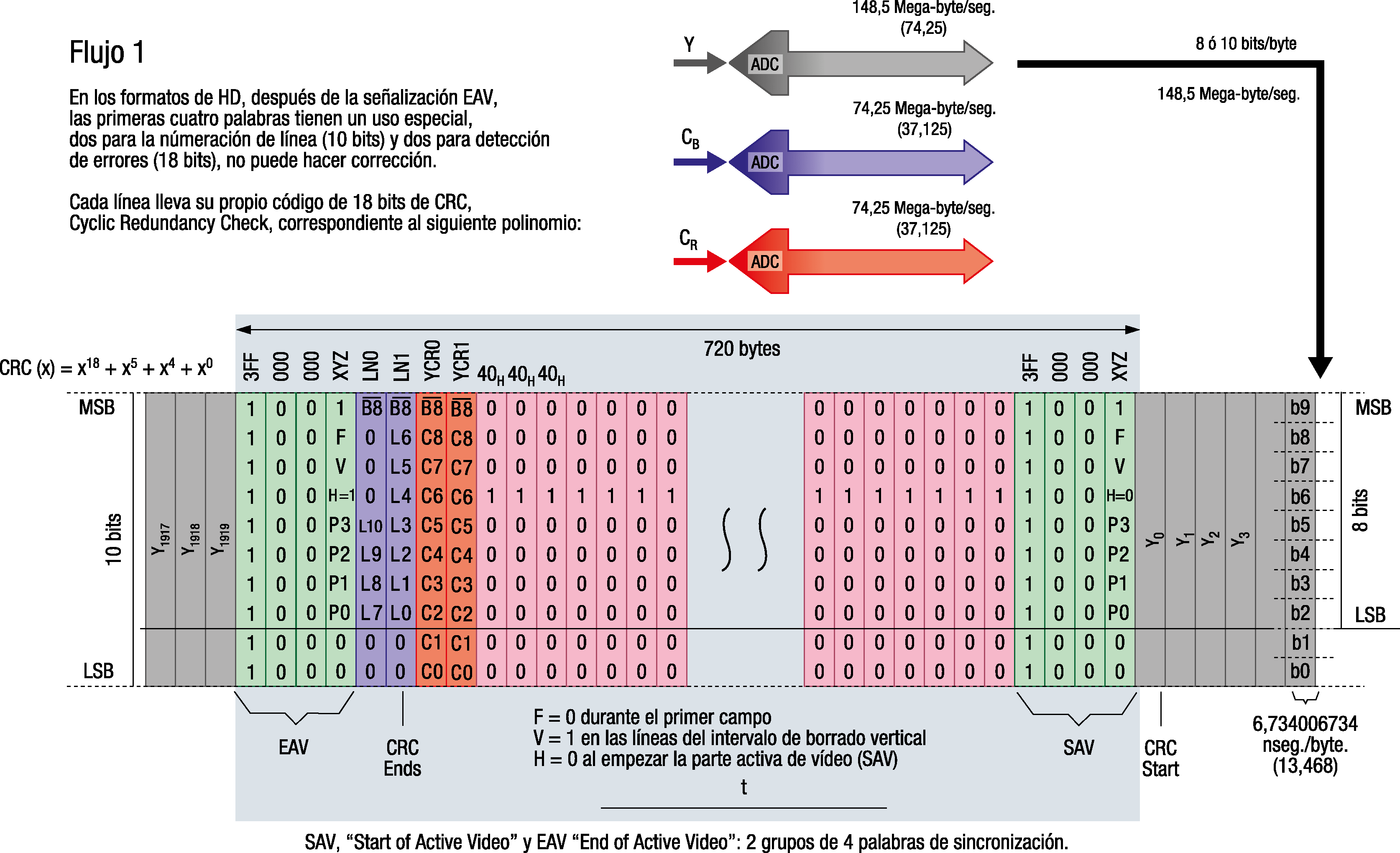 Como se puede comprobar en la figura anterior, a los impulsos TRS del EAV de cada uno de los flujos, se le añaden cuatro palabras o bytes más. Dos de ellos nos van a identificar en qué línea nos encontramos y otros dos bytes más para la corrección de errores.
