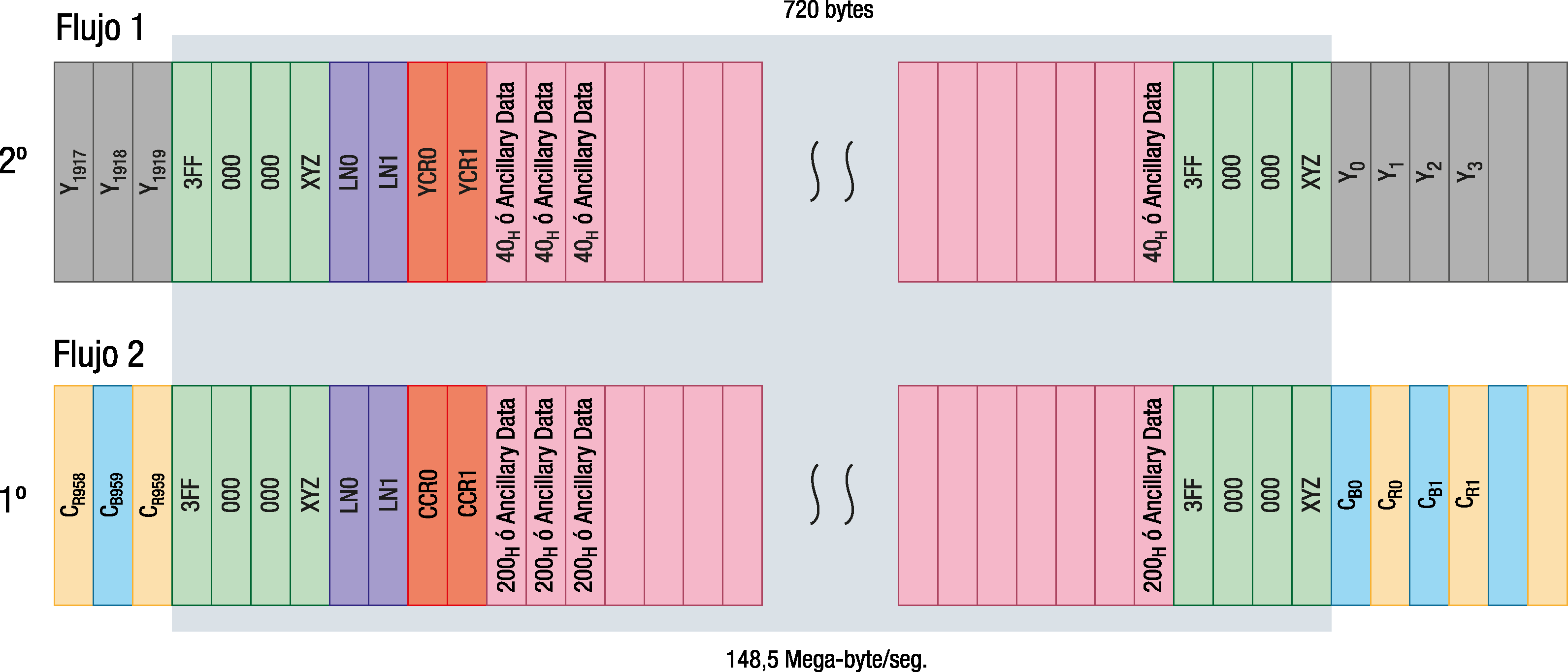 Como se puede comprobar el flujo de datos 1 transporta los datos de la luminancia y el flujo de datos 2 transporta los datos de las señales diferencia de color Cb y Cr.