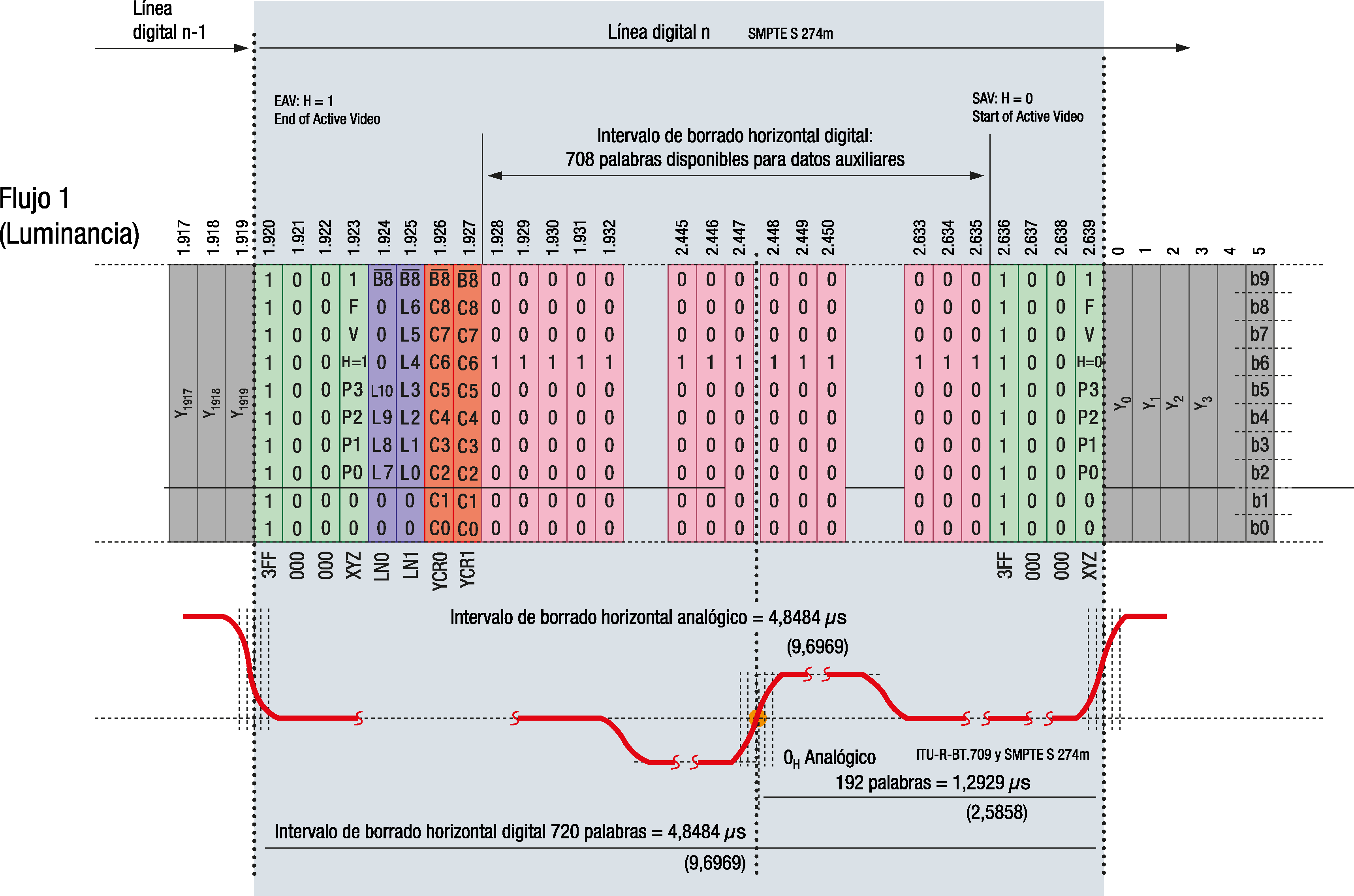 Por último, nos queda ver la similitud entre una línea de vídeo analógico en alta definición y una línea de vídeo digital en alta definición, concretamente en el periodo de borrado de línea.