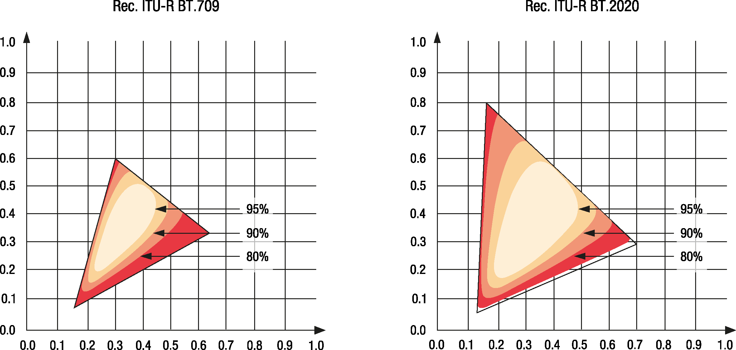 Esto se puede comprobar claramente en la siguiente figura cotejando los sistemas de televisión en HD y en UHDTV (según las normas ITU-R BT 709 e ITU-R BT 2020), en donde se puede comprobar que en ambos sistemas, cuanto más nos acercamos al D65, o sea, al blanco de 6.500º Kelvin (que no tiene saturación de color) más nos aproximamos al 100% que nos referíamos antes, disminuyendo éste cuanto más aumente la saturación de los colores.