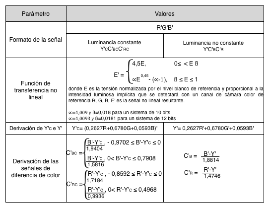 Para describir el formato de la señal de vídeo UHDTV, nos tenemos que ceñir a los valores que nos indica la recomendación ITU-R BT.2020-0, donde podemos comprobarlos en la siguiente tabla.