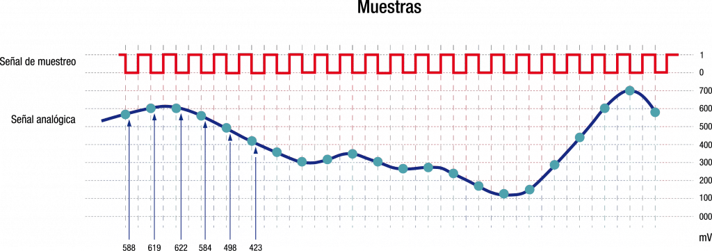 Si te fijas en la figura anterior cada vez que se produce un flanco de bajada de la señal de muestreo se toma una muestra de la señal de vídeo analógica. En realidad, la norma no indica si la muestra hay que hacerla en el flanco de bajada o en el flanco de subida, lo deja a elección del fabricante del equipo.