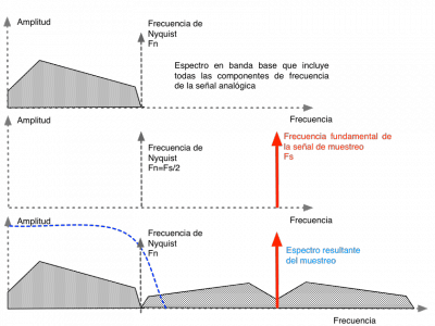 Pues verás, si compruebas la figura anterior, se puede ver que si la frecuencia de muestreo no fuese del doble que el ancho de banda de la señal a muestrear, ocurriría lo que se ve en la parte inferior, o sea, que las bandas laterales (bandas laterales vestigiales) que se crean alrededor de la frecuencia de muestreo se solaparía con el ancho de banda de la señal de vídeo y se produciría un batido de frecuencias que aparecerían en la pantalla como “aliasing”.