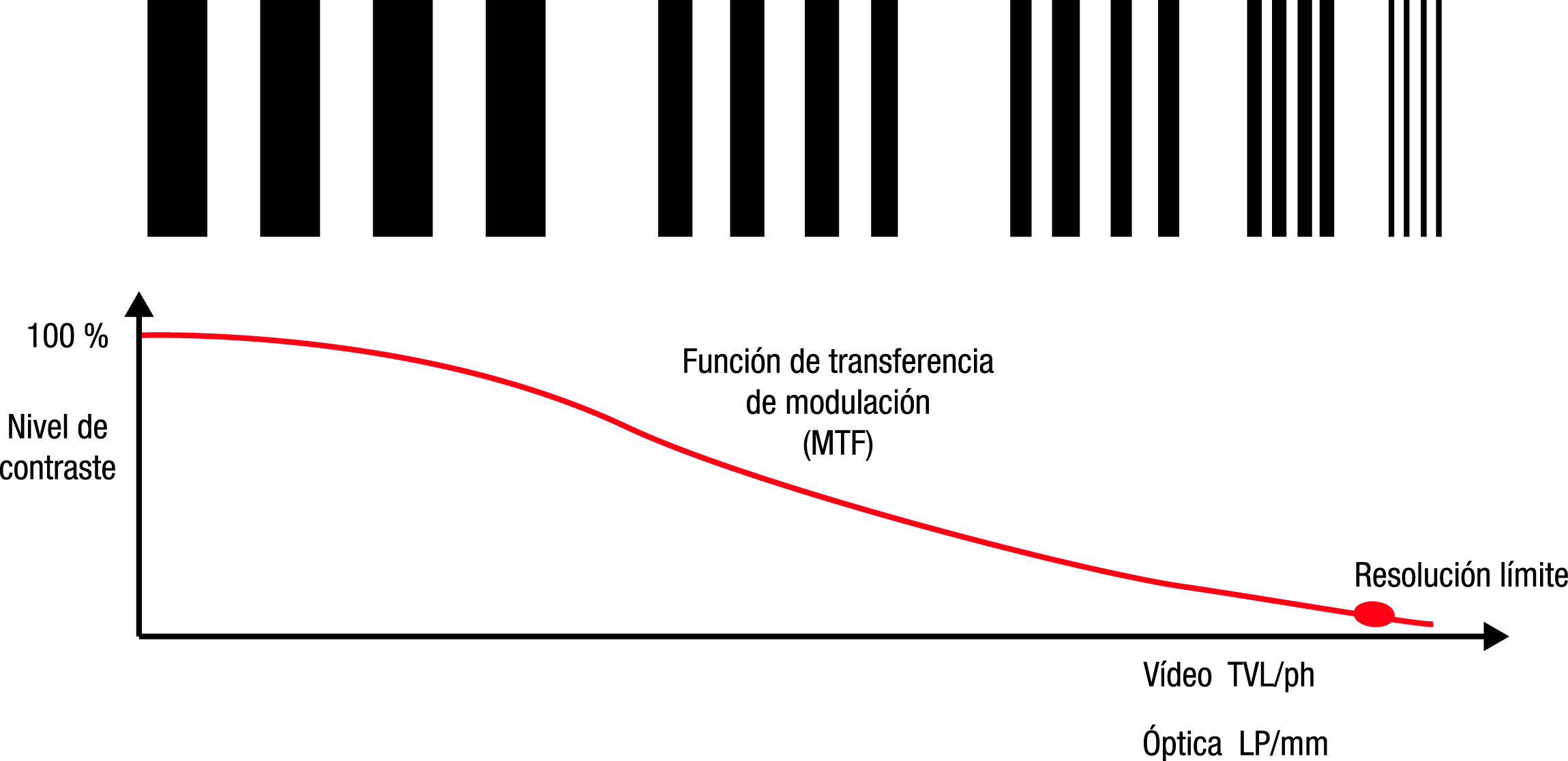 Este parámetro se utiliza para mostrar el comportamiento del nivel de contraste en barras negras y blancas que cada vez son mas estrechas, o sea, que va aumentando su frecuencia. El MTF del sistema es la modulación del nivel de contraste de pares blancos y negros y que sucesivamente son más altos de nivel. Es por esto que la interpretación del contraste esta estrechamente ligada a la agudeza de imágenes que podemos percibir. Hay una curva que utilizan los constructores de lentes en la que se muestran por un lado la reproducción del contraste, en el eje vertical, contra el detalle espacial, eje horizontal.